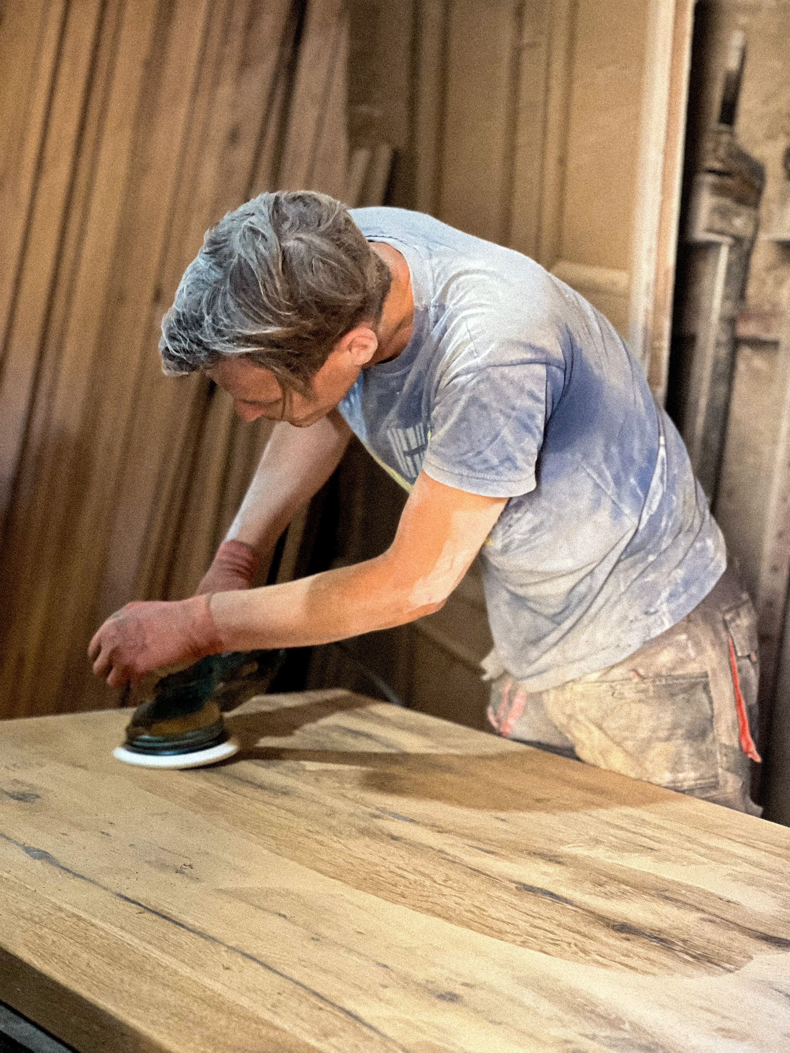 Koristimo recikliranu hrastovu građu dobivenu dekonstrukcijom starih slavonskih kuća i objekata. Svaka stara drvena građa, bilo da se radi o hrastovim gredama, rogovima ili plankama, prolazi kroz proces ručne obrade kako bismo osigurali da svaki komad zadrži patinu, prirodne godove i ožiljke vremena. Završnu obradu radimo s visoko kvalitetnim lakovima za drvo, otpornim na grebanje i tekućine, čime osiguravamo dugotrajnost i otpornost.